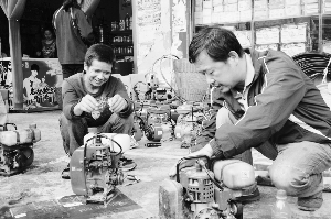 眼下,秋收到来,我州农民不失时机,纷纷到农机市场选购农机、农具、农肥,迎战秋收秋种。在市场上,传统秋收农机具仍然呈现供需两旺之势,小型汽油打谷机、电风车、玉米脱粒机等小型农机倍受山区农民欢迎,已成很多农村家庭必购的农机具。图为9月5日,永顺县吊井乡的农民正在乡场上选购体积小、重量轻、适应性强的汽油打谷机,为秋收作准备。 通讯员 吴 华 摄
