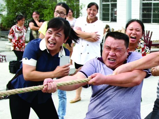 9月9日,花垣县团结镇教师和政府干部举行拔河比赛。当天,该镇开展庆祝第30个教师节活动,表彰了64名优秀教师,并举行拔河等文体活动。 龙恩泽 摄