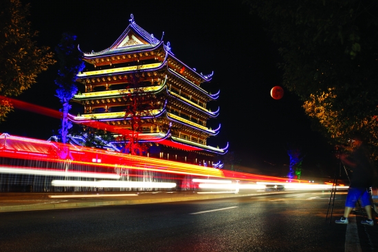 涉江吟橘颂,红月曜琼楼。四年来最美的月全食亮相天空,10月8日18时25分开始,市民们目睹了最美一小时“红月亮”的风采。图为当晚18时30分泸溪县白沙城古香古色的涉江楼与“红月亮”交相辉映的美丽夜景。 向民贵 张克宁 摄