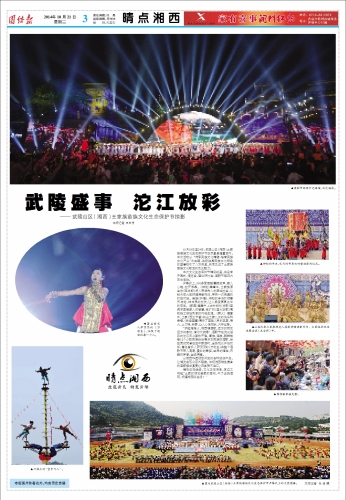 本报记者 田宏贵 10月18日至24日,武陵山区(湘西)土家族苗族文化生态保护节在凤凰县隆重举行。本次活动以“传承民族文化精髓·培育民族文化产业”为主题,这场独具民族文化特色的盛事吸引了八方来宾,共同见证了土家族苗族文化散发的无比魅力。 本次文化生态保护节精彩纷呈,共设有开幕式、博览会、理论研讨会、酒歌节等四大主体活动。 开幕式上,200多面苗鼓震撼发声,撼人心魄,拉开序幕。《神地》篇章中,土家族原生态《毛古斯》将人带进先人的原始社会,从钻木取火到狩猎满载而归,带来一次完美的时空对话。苗族《祈福》,神秘的手决引领着天与地、神与灵的交流,让人感受冥冥之中的存在。《家园》篇章中,148米长的《古歌》苗绣尽显苗家人的智慧,粗犷的《酉水放歌》展现船工惊险刺激的行船生涯。《薪火》篇章中,土家《西兰卡普》织出土家儿女的快乐和幸福,《武绝苗疆》展示了苗族人民的英勇,喷火、上刀梯、杂耍,让人心惊肉跳,大呼过瘾。 “燃起堆堆火,湘西唱酒歌,远方的朋友远方的客哟,请你大碗喝”,酒歌节在流光溢彩的沱江河上豪放开唱。藏族、瑶族、朝鲜族等12个少数民族纷纷展示本民族的酒歌,当空灵的梵音在空中飘荡时,全场观众开始欢呼,著名音乐人萨顶顶的《万物生》将整个酒歌节带入高潮,曼妙的舞姿,空灵的唱腔,天籁的声音,全城沸腾。 以湘西非遗项目开发的各种旅游产品,让博览会观众目不暇接。体现湘西特色美食的苗家接龙宴更让来宾赞不绝口。 精彩还在继续,文化正在传承,耳边又响起“土家的朋友苗家的客哟,干了这碗酒啊,祝福湘西好生活!” |