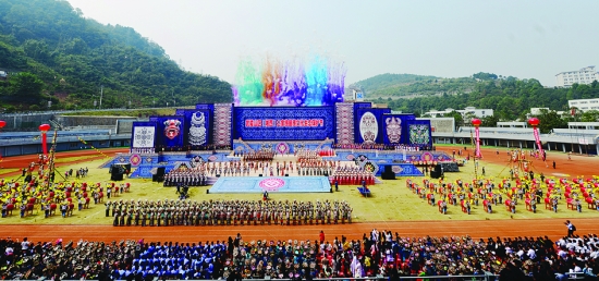 ▲图为武陵山区(湘西)土家族苗族文化生态保护节开幕式上的大团圆舞。 本报记者 张 谨 摄