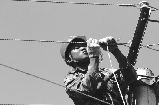 11月12日,花垣县团结镇永丰村,电力施工人员在忙着架接高压电线。当天,该村基本完成了农网改造任务,村民用上了“放心电”。今年,该县计划完成38个行政村的农网改造建设,确保农民用上“放心电”,温暖过冬。 龙恩泽 摄