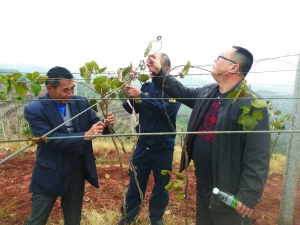 11月12日,在泸溪县武溪镇朱食洞村红心猕猴桃种植示范基地,该县人口计生局、交管所、新农合局驻村扶贫工作队员与村民一道查看猕猴桃树苗长势。