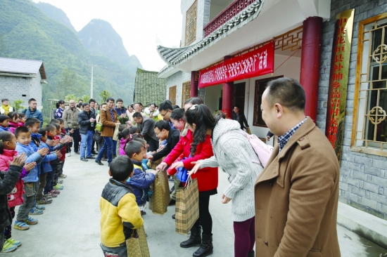 12月5日,我州2012届公选高学历人才及州委党校相关负责人一行60余人来到花垣县补抽乡高岩村,开展“关爱留守儿童暖冬行”活动,为该村50名留守儿童每人送上一份有手套、围巾以及各种学习用品的暖冬礼包。图为礼包发放现场。 本报记者 龙佳义 摄