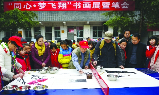 12月10日,寒风呼啸,吉首市第七小学校园却暖意浓浓。由州委统战部和民盟湘西州委组织的“同心·梦飞翔”书画展暨笔会在这里进行。民盟的众多书画家现场挥毫泼墨,给学生们献上了一场传统文化盛宴。图为民盟专家在给孩子们现场教授书画。 向水生 刘湘萍 摄
