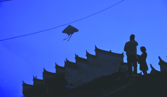 龙山里耶古镇,这里出土了举世闻名的秦简。5月1日,一对青年在防洪堤上放风筝。