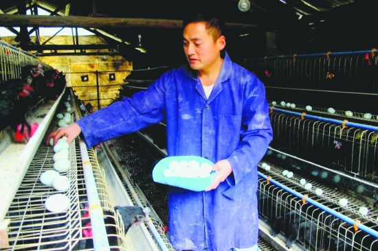 近日,吴正峰正在绿壳蛋鸡养殖场捡鸡蛋。 保靖县清水坪镇中溪村退伍军人吴正峰,2012年在保靖县金山坡养殖专业合作社、县农村信用联社的大力支持下,投资15万余元,在保靖县清水坪镇中溪村建起了300多平方米的绿壳蛋鸡养殖场,采用科学、生态方式喂养。目前,他饲养绿壳蛋鸡2000多羽,年产绿壳蛋30多万枚,销往湘渝边区周边市场,产品供不应求,年收入高达20多万元。