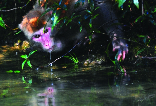 8月2日,猛峒河风景区,一只猴子在河边喝水,眼睛叮着过往的游船。