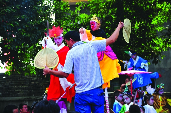 8月7日,热且闷,泸溪县在浦市举办中元节,一位孩子的家长担心表演的孩子中暑,用两把蒲扇给孩子们扇凉。