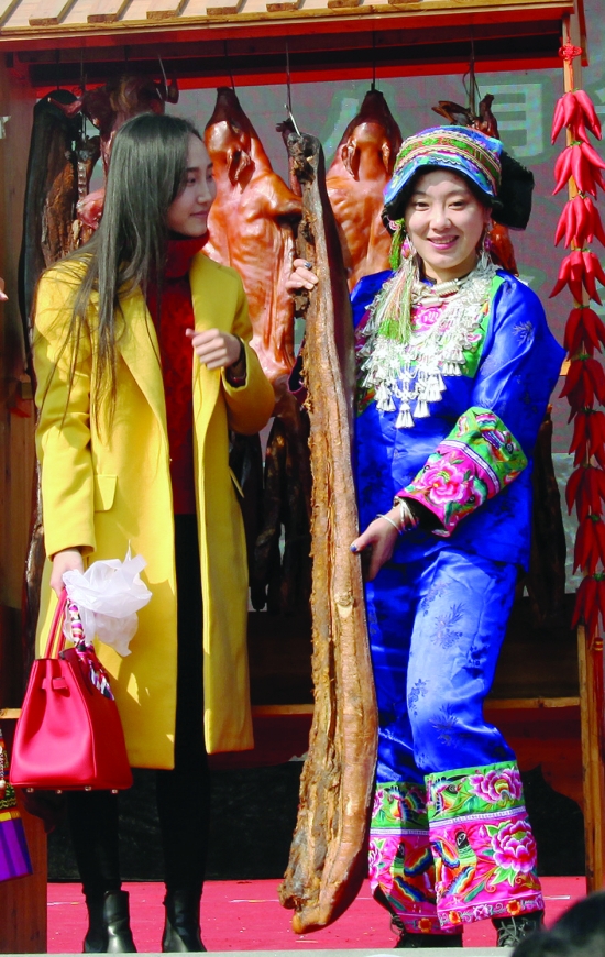 12月20日,在农博会上,一位顾客以2000元的高价成功拍得葛四民族食品开发有限公司的“腊肉王”。“腊肉王”长1.6米,耗时3个月熏制而成。农博会开幕至今,葛四腊味销售火爆,营业额已达10万元,并与10余家州内外企业商洽合作。 李中云 摄