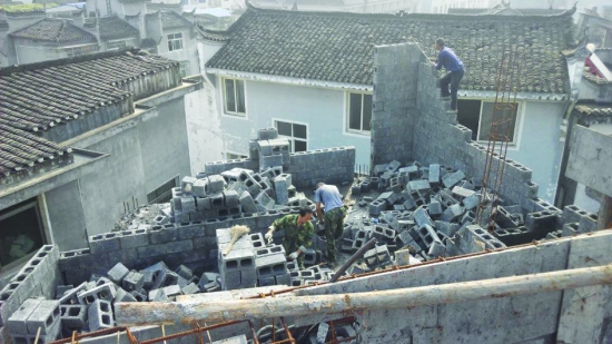 住建部门督促屋主自行拆除,工人正在施工。 黄珍权 摄