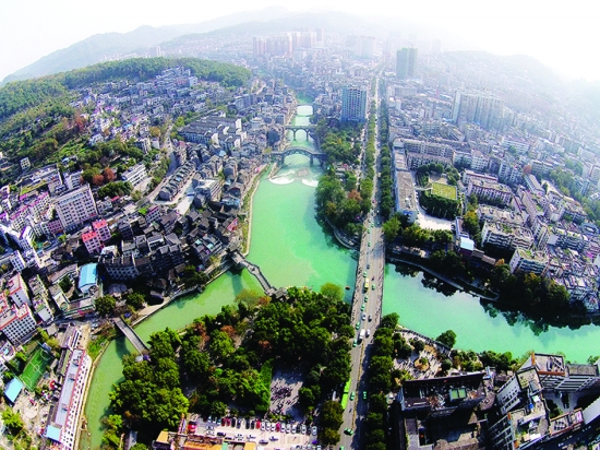 河水清了, 河岸绿了, 市民笑了。近年来,吉首市大力发展绿化与污水处理工程的建设,使老城区的空气与水质明显改善。图为12月29日,治理后老城区的鸟瞰图。 张 谨 韩 非 摄