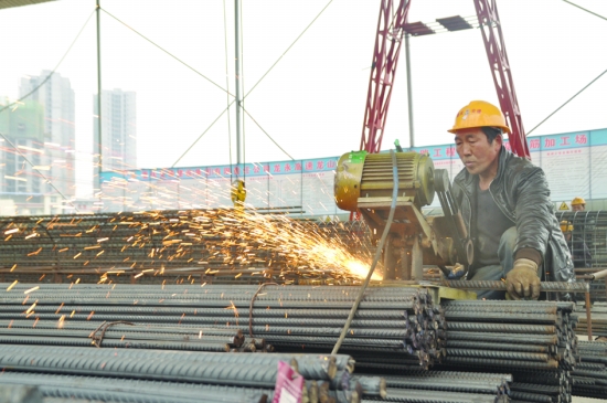 为确保2015年国庆期间龙(龙山县)永(永顺县)高速公路龙山连接线县城段道路建成通车,建设者加班加点赶工。图为1月1日,工人在建设工地进行钢筋切割作业,在忙碌中度过元旦。 田志波 田春阳 摄