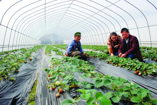 草莓大棚里,村主任周望喜(右一)和种植大户一起查看草莓的长势。