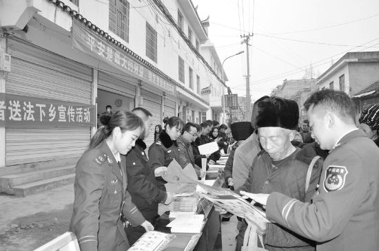 1月12日,凤凰县政法系统干警深入腊尔山镇墟场开展“送法下乡”活动,现场为群众解答各种涉法咨询520余人次,发放《消防法》、《土地承包法》、《婚姻法》、《法律援助条例》等法律法规资料2600余份,深受群众好评。 麻召玉 摄
