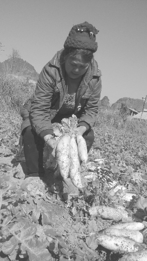 近日,花垣县道二乡道二村村民梁双玉正在自家地里拔白玉春萝卜,准备卖往苗汉子野生蔬菜专业合作社。58岁的梁双玉在自家闲置的地里种了3亩白玉春萝卜,按一亩2000斤,一斤售价0.25元计算,她今冬可增收1500元。据了解,苗汉子野生蔬菜专业合作社是集野生果蔬开发利用、产品研发、技术服务、生产加工、销售以及品牌文化建设为一体的新型农业合作社。社员从108户发展到635户,种植面积扩展到3051亩,范围辐射县内七乡镇。该合作社通过“合作社+公司+基地+农户”的生产经营模式,带动周边百姓一同致富。 杨 木 摄 |