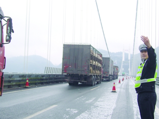 1月29日上午11时许,吉茶高速公路矮寨大桥经过连夜破冰恢复通行,滞留路面的车辆陆续开行。 1月28日晚,湘西地区气温骤降,导致州内高速公路多处路面出现结冰现象。其中矮寨大桥路面结冰,致使沿线滞留车辆无法通行。省高警局湘西支队立即启动交通应急预案,全员取消休假,对该路段实施破冰融冰行动。 据悉,我州低温天气仍在持续,州内高速公路桥梁将面临冰