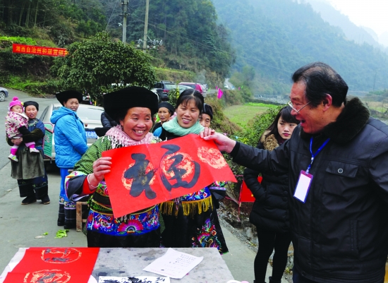 1月31曰,吉首市寨阳乡补点村村民高兴地接过免费的春联。当日,州直摄影家协会2015首届新春年会在该村举行。协会特邀请了州老年大学书法班喻仁周等几位老师现场为苗族群众免费书写春联,受到该村广大苗族群众欢迎。 陈绪新 摄