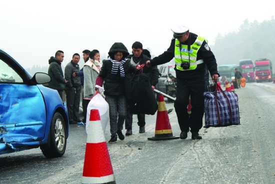 1月31日,吉茶高速花垣县麻栗场大桥上,高速交警在忙着帮助转移乘客。连日来,受持续低温冻雨天气影响,湘西地区多处高速公路桥梁路面结冰。当天上午,4台车辆在该桥上发生追尾事故,高速交警及时赶到事故现场,抢救伤者,转移被困乘客,很快恢复交通。 龙恩泽 摄