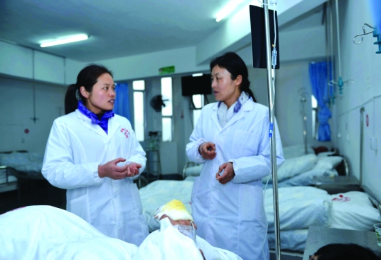 田蕊与医生田海蓉在交流患者的病情,因为病人手指砍伤后感染严重,可能需要截肢手术,她们商议将他往上级医院转院治疗。