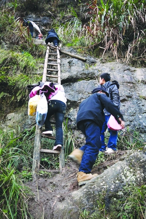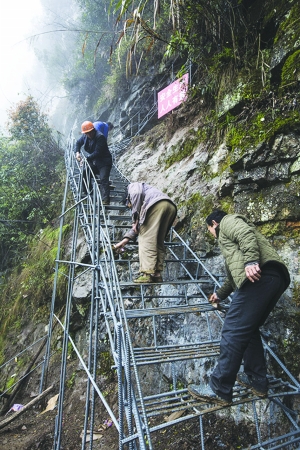 由凤凰县柳薄乡科甲村村民施志光、施金长、龙牛海策划筹资、施工管理,在花垣县补抽乡大龙洞风景区龙洞山上新建的钢梯于3月22日完工,极大方便了凤凰县柳薄乡、米良乡10个村数千村民的出行,确保了群众出行安全。 米跃进 摄