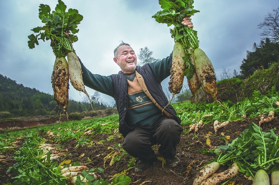 3月27日,花垣县花垣镇略坝村绿郁馨蔬菜专业合作社社员龙基泽喜收萝卜。该合作社吸收留守老人入社,解决他们的农产品销路难题。同时,流转土地后有效地防止了因大量青年外出务工而造成的土地抛荒状况。目前,花垣县共有这样的农业专业合作社274家,带领万余农户致富。 石林荣 摄