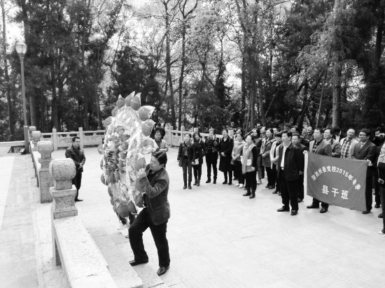 4月10日,州委党校2015年春季县处级干部进修班学员来到永顺县塔卧镇进行革命传统教育,增强学员们的党性修养和党员意识。图为学员们向烈士纪念碑敬献花圈,缅怀先烈。 樊竹青 麻松林 摄