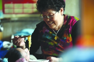 4月17日,杜秀荣在给养女喂面条。