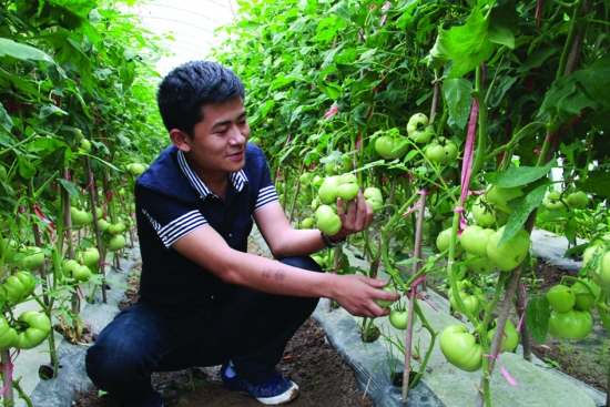 5月16日,保靖县碗米坡镇押马村村民胡竣胜在观察西红柿长势。2013年胡竣胜大学毕业后回村先后注册成立了“保靖押马蔬菜产销专业合作社”“保靖振新农业科技开发有限公司”,并采取“公司+合作社+农户+基地+直销点”的经营模式,流转土地2000余亩大力发展绿色无公害蔬菜产业,产品远销长沙、怀化、张家界、铜仁、恩施等城市,年产量5000余吨,产值1200万元,直接或间接解
