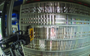 5月21日,“24小时城市街区自助图书馆”内部的智能取书机械人在工作后台按照读者的需要取拿图书。