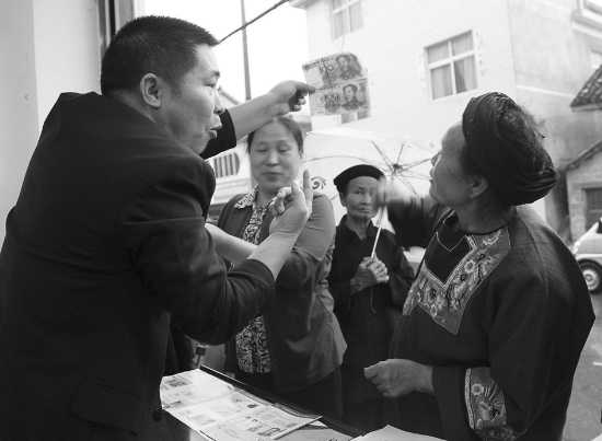5月15日,在花垣县董马库乡的圩场上,工作人员拿起一真一假两张百元人民币对着亮光处向群众介绍怎样识别假币。这天,由该县公安局牵头组织工商、农行工作人员来到该乡开展打击和防范经济犯罪宣传活动,发放资料千余份,面对面给群众介绍识别假币的知识。 石绍辉 摄
