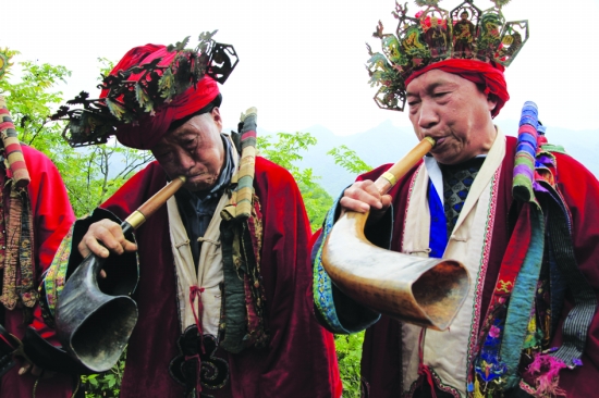 凤凰县山江镇八公山,法师吹响了祭祖的号角。