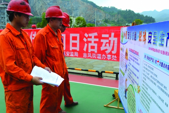 6月16日,在全国安全生产宣传咨询日到来之际,湘西经济开发区和吉凤街道一起开展安全生产宣传日咨询活动。图为6月16日,辖区工地工人正在观看宣传展板、领取宣传资料。 刘振军 张河锦 摄