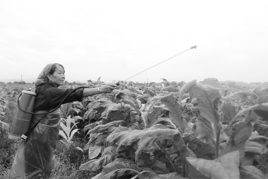 6月23日,泸溪县兴隆桑蚕专业合作社社员正在烤烟地里喷洒农药。当前正是烤烟成熟时期,也是各种病虫危害烟叶严重时期,为确保烟叶获得更大丰收,该县采取一系列有效措施,加大了烤烟后期培管工作。 覃仁岗 摄