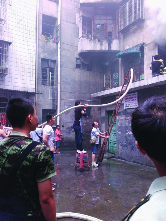 救火现场,扛水带者为阿卜杜合力力·佧迪尔,他在救火现场坚持了近两个小时。
