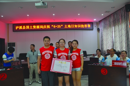 6月25日,泸溪县国土资源局通过国土资源法律法规知识抢答赛的方式,学政策、比业务、强素质、促服务,庆祝第25个全国土地日抢答赛。近一个月来,该局采取全员参训、闭卷考试方式,选拔代表分成局机关、二级机构、执法监察大队、国土资源所等队进行最终抢答比赛。图为获得一等奖的该局局机关代表队。 记者 谭必文 通讯员 杨明甲 摄