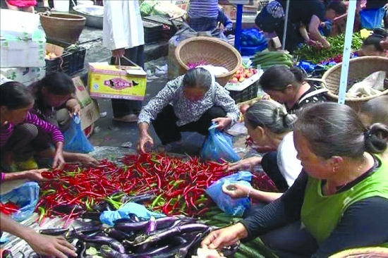 6月18日,在泸溪县兴隆场镇圩场上,色泽诱人新鲜上市的早熟玻璃椒吸引了人们纷纷购买。 唐正海 摄