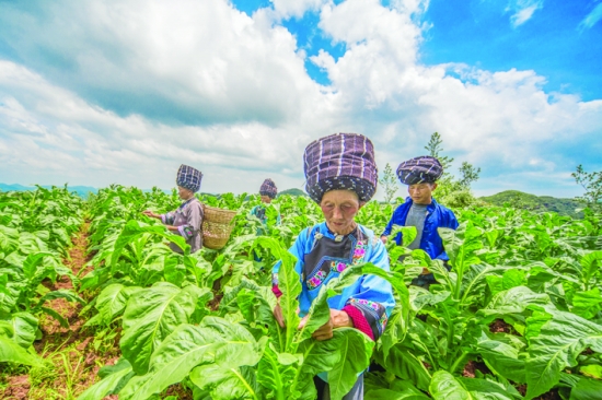 6月28日,花垣县雅酉镇排腊村村民在给烟叶打顶抹叉,一片丰收在望的喜人景象。据了解,该镇今年共种植烟叶3515亩,能产烟7000余担,按去年1300元每担的均价计算,今年能创收1000余万元。 石林荣 摄