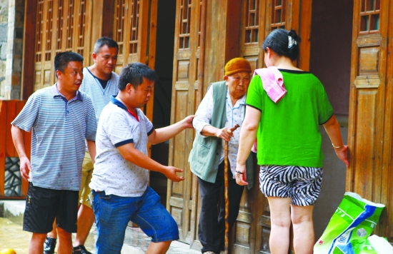 边城古镇居民正在将一名老年妇女转移到安全地带。