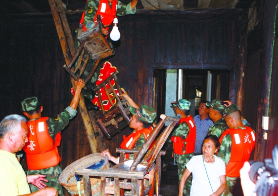▲ 县武警中队武警官兵在帮助边城古镇老街受灾居民转移家产。