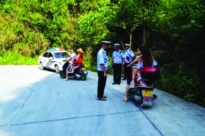 7月20日,永顺县交警大队执勤交警在老司城路上检查执勤。随着老司城遗址申遗成功,到老司城旅游的游客与日俱增,平时车流量每天达400多台,周末要比平时多一倍,该县交警大队派出6名得力交警,在路边搭起“草棚岗亭”,全天候执勤。