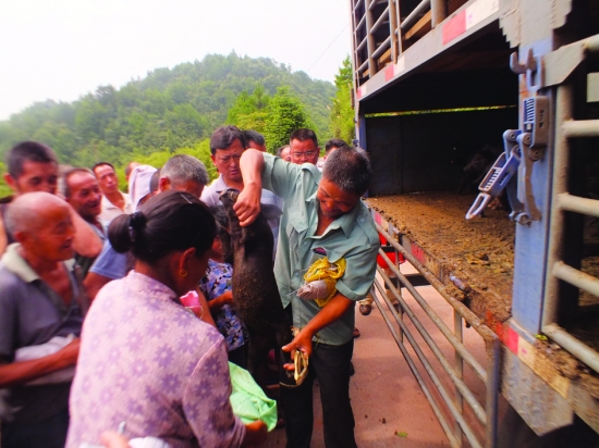 ▲为帮扶贫困村早日脱贫致富,7月18日,泸溪县扶贫办从潭溪镇铁骨猪养殖基地挑选142头优质铁骨猪仔发放到宋家寨村70户精准扶贫识别户手中。年底,这批铁骨猪将以高于市场价10元/公斤的价格进行统一收购,这将为宋家寨村村民增收40多万元。图为村民领取猪仔现场。 王 芳 孙高翔 摄