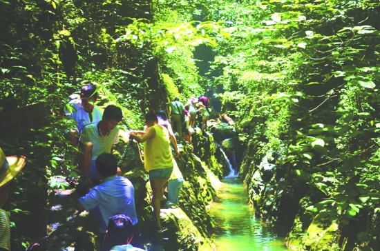 连日来,我州一直持续高温、晴热、少雨的天气,可谓真正开启了“烧烤模式”。酷暑骄阳令正在申报国家4A景区的古丈县坐龙峡景区一片火热。该峡谷位于红石林镇,全长约6500米,最大高差达300余米,集俏、隐、幽、旷、奇、险、古、拙于一体,有“中南第一奇峡”的美誉。图为8月1日,大批游客在景区内避暑纳凉、探险游玩。 宋勇云 摄