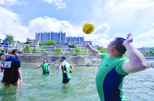 8月10日,选手们在湖北省宣恩县城区贡水河上参加“水上排球”比赛。