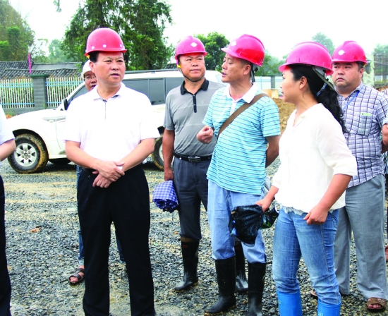 州委书记叶红专(左一)一行到龙山县石羔水厂了解工程建设进度。 梁金梅 摄