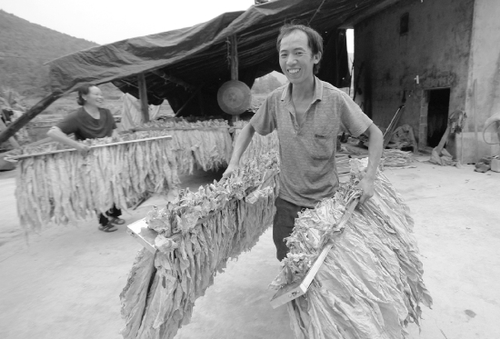 8月13日,花垣县吉卫镇下水村,村民在忙着收烟叶。今年,该镇种植7000多亩烤烟喜获丰收。目前,烟农正在抓紧时间收烤烟叶。 龙恩泽 摄