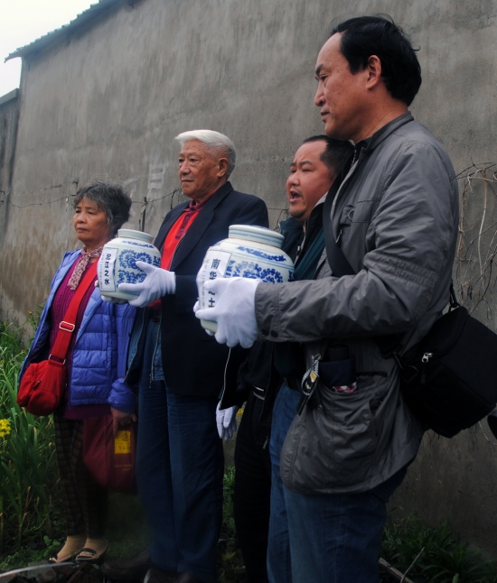 今年4月,128师师长顾家齐之子顾远扬、副师长戴季涛的孙子戴进红到嘉善祭奠牺牲在抗日战场上的湘西子弟兵,并将特意带去的沱江之水、南华山之土撒入嘉善的河流之中。 (资料图片)