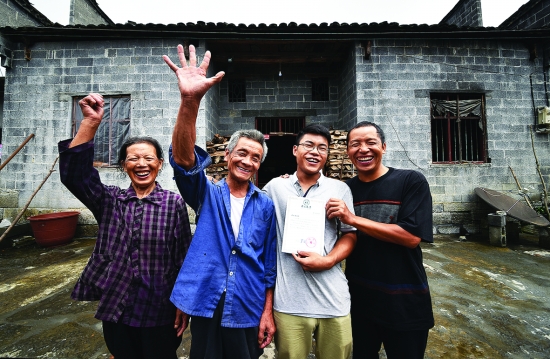 吴宗荣捧着中山大学的通知书在家门前与父母、老师合影。 2008年,他曾作为凤凰受援助学生代表,受邀到嘉兴学院参加暑期活动。如今终于考上了满意的大学,他已决定,等新学校安顿好就争取再去一次嘉兴学院。