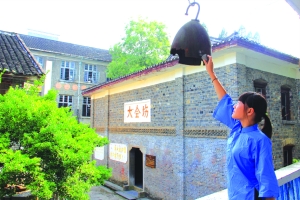 9月1日,花垣县第三中学,一名共青团员在敲“炮弹钟”,警醒师生不忘国耻、奋发图强。据了解,该钟是抗战时期,安徽省等地师生流亡于设立此地的国立茶峒师范学校时,用从沦陷区带来的日军炮弹壳制作而成。“炮弹钟”一直沿用至今,成为该县师生记住历史,不忘国耻的“活教材”。 吴红艳 摄