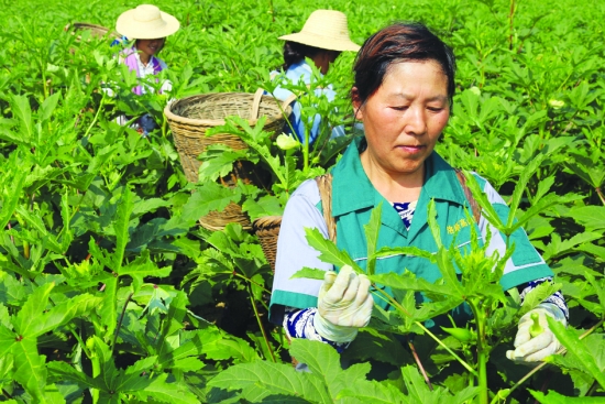 8月28日,龙山县洛塔乡砂桥村农民在湘西高山原味电商农业基地采摘从国外引进种植的黄秋葵蔬菜。42岁的罗世刚在外打工十几年回到家乡,和朋友筹资发展湘西高山原味电商农业,通过“公司+基地+农户”模式发展高山有机无公害蔬菜产业,引进种植黄秋葵蔬菜。黄秋葵俗名羊角豆,从非洲引进种植,被誉为人类最佳的保健蔬菜之一。据调查,现在市场上销售每公斤40元,其市场